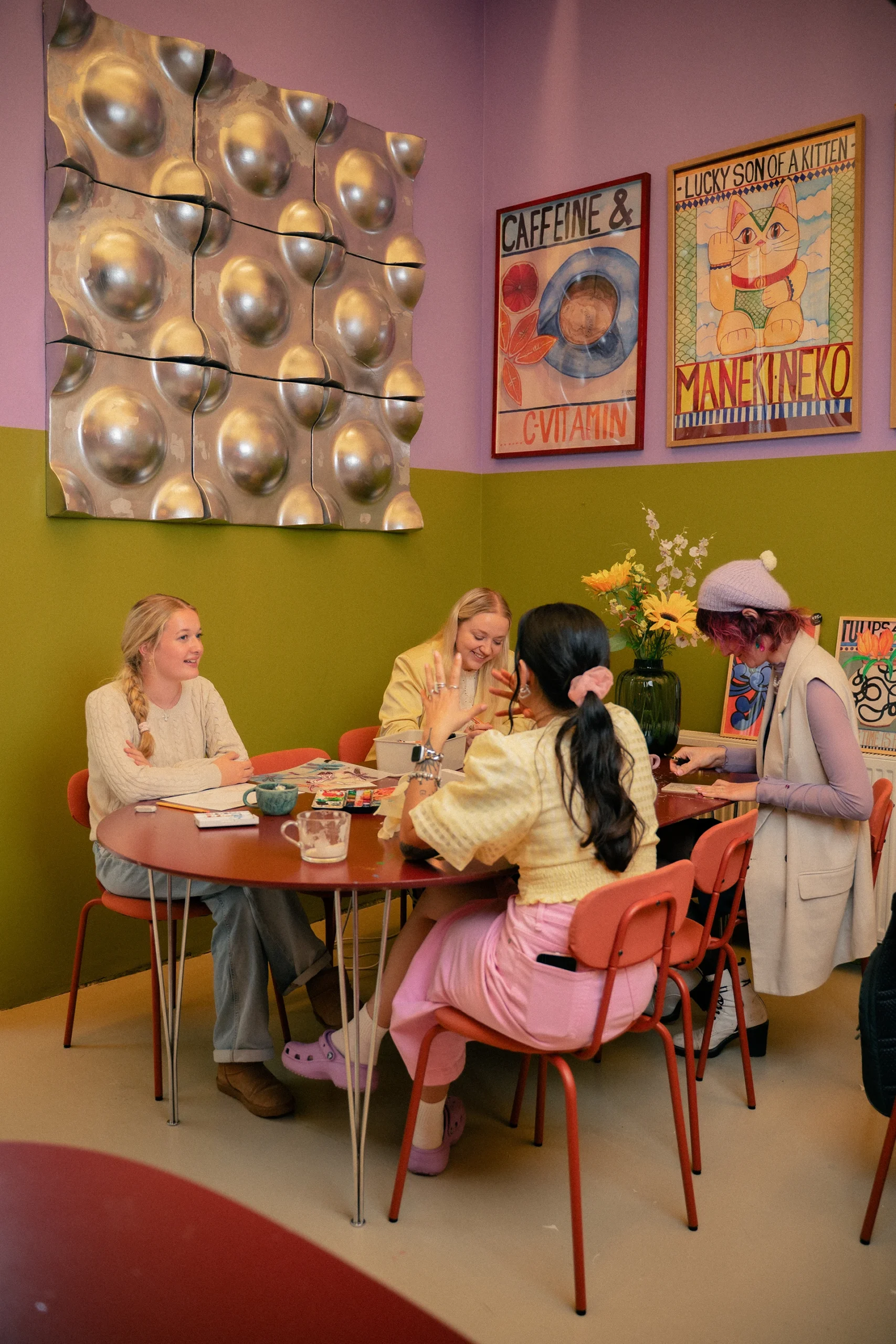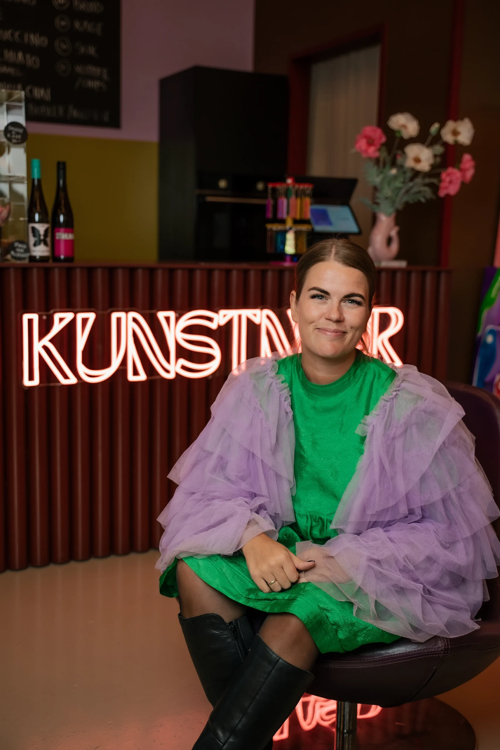 KUNSTNÆR er mit univers af farver, værker og plakater – men også et fælles frirum. Et sted, hvor vi udfordrer præstationskulturen og beige-bølgen med kreativt kaos, glimmer på gulvet og plads til nærvær. Her handler det om at slippe kontrollen, lege med farverne og være sammen om at skabe noget, der kan mærkes.