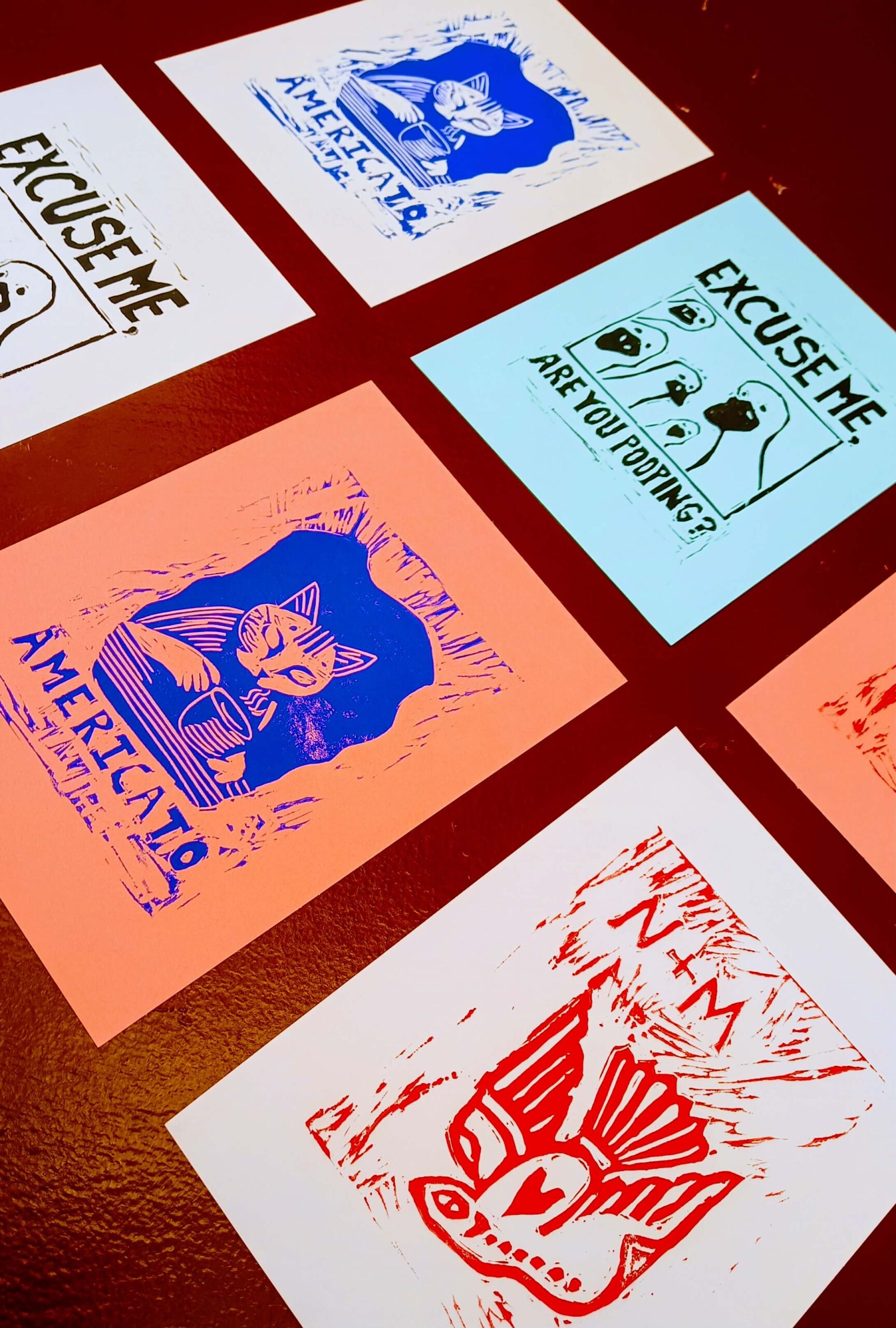 A6 softcut plade, prøve tryk og to færdige tryk på A5 kvalitetspapir.