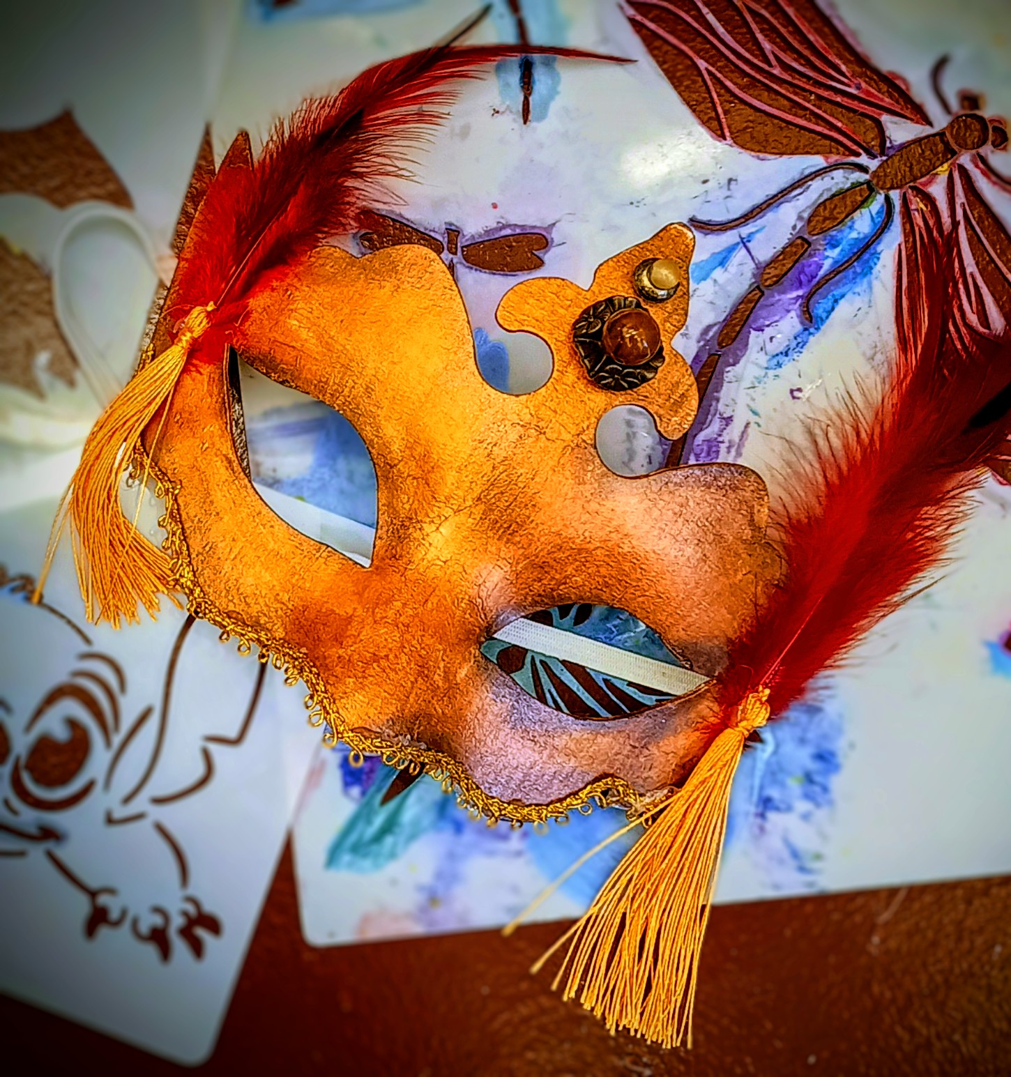 Valgfri maske, som kan males med akrylmaling, dekoreres med fjer og glimmer.